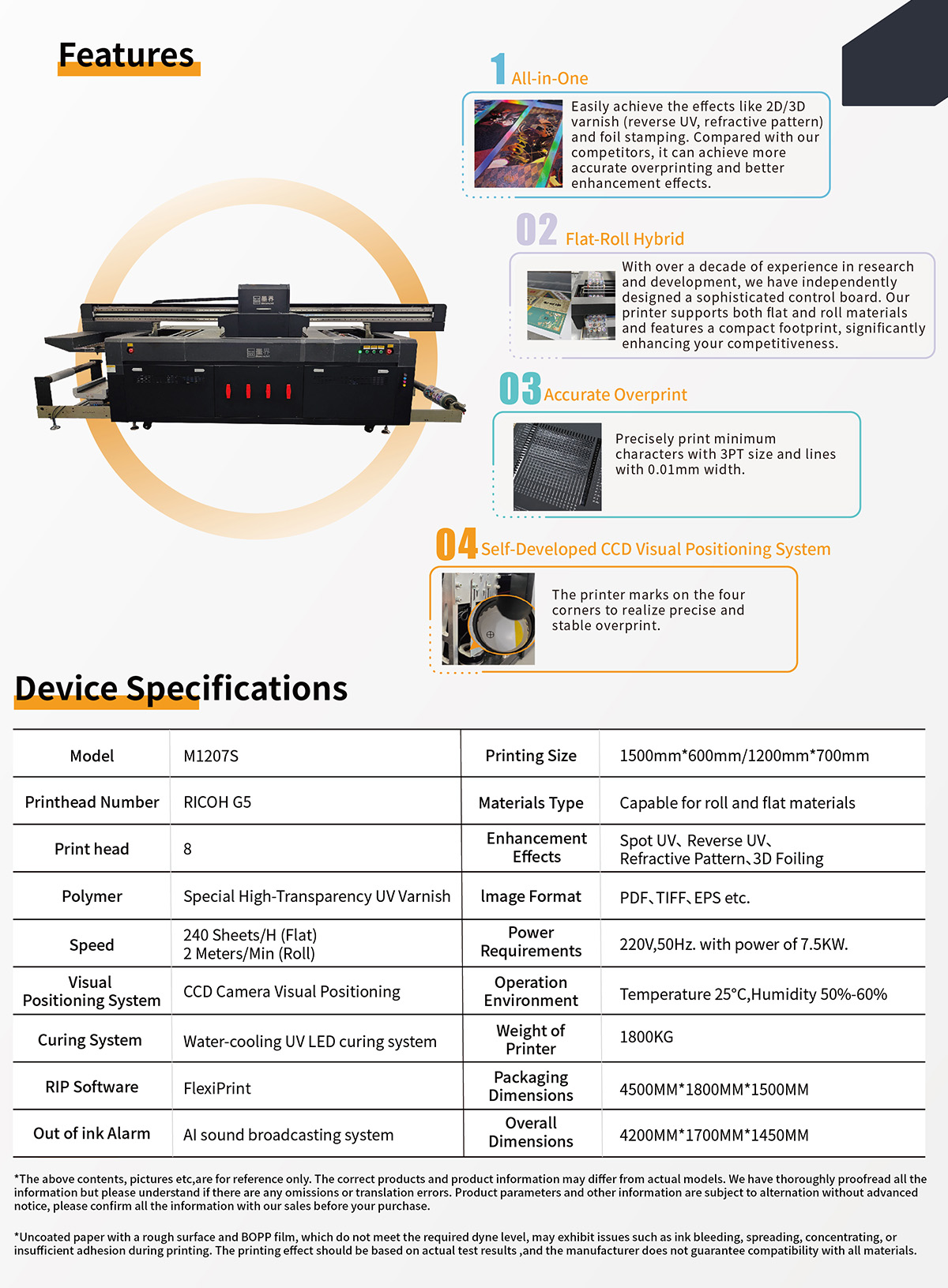 The M1207S is a versatile flat-roll hybrid UV enhancement printer, designed for “all-scenario print enhancement” needs. It features visual positioning (powered by a self-developed CCD visual positioning system) for precise alignment, supports Reverse UV printing and a variety of vivid enhancement effects (including Spot UV, Refractive Patterns, and Crystal UV) with special high-transparency UV varnish output—focused solely on varnish-based enhancement. It works seamlessly with both rigid flat materials and flexible roll materials, and can be perfectly paired with HP Indigo (e.g., Indigo12000) and Konica Minolta (e.g., KM-1e) devices to expand production possibilities .(For specific details regarding parameters and pricing, please consult our sales team.)